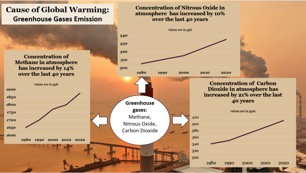 Greenhouse gases like Methane, Nitrous Oxide, and Carbon Dioxide. are the main causes of global warming. The Picture depicts how these increased over time.