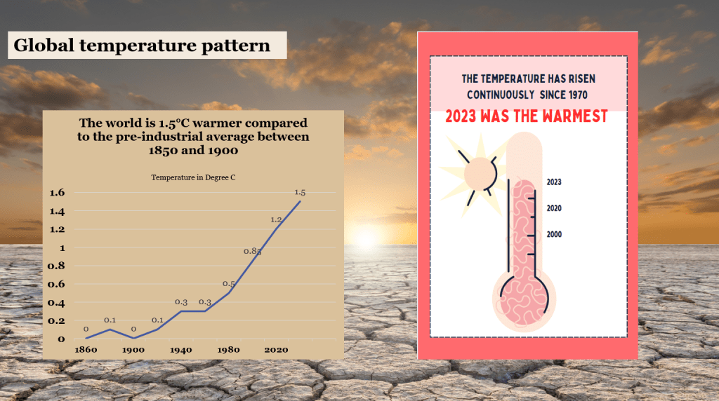 The picture shows the global temperature rise from 1860 to 2024. The year 2023 was the warmest, with an average temperature of 1.5 degrees C higher than its pre-industrial average.