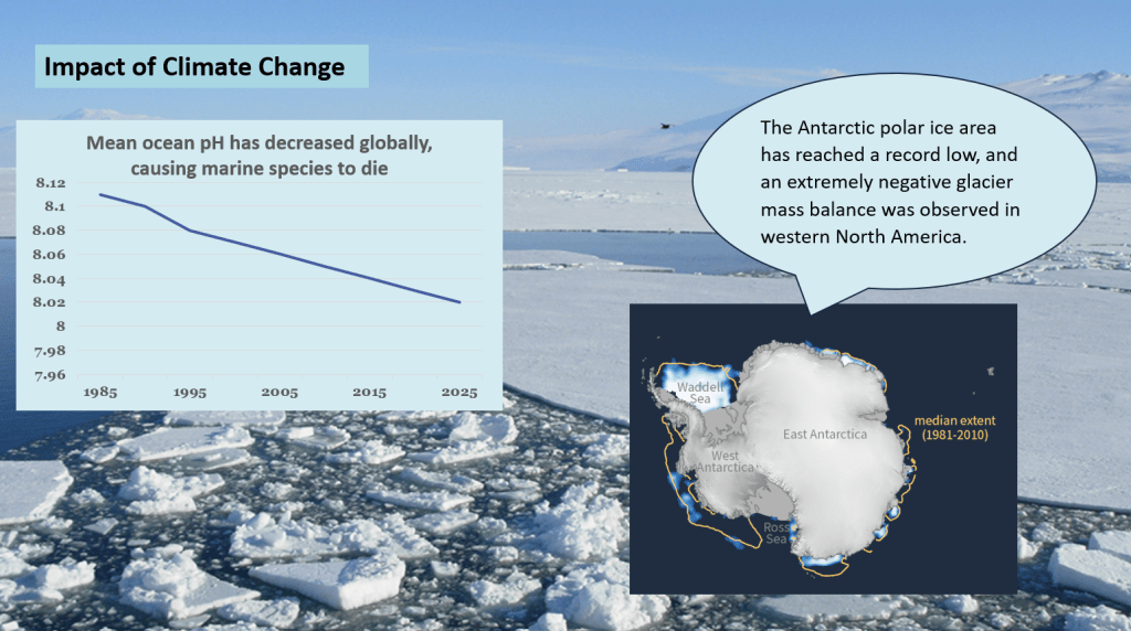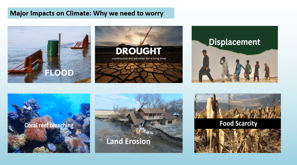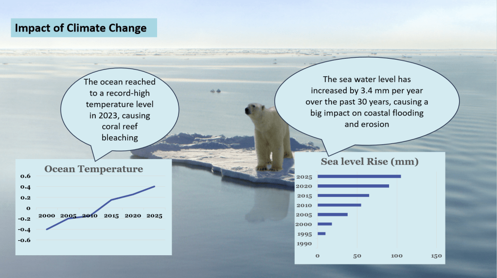 We can observe many impacts of climate changes such as the rise of ocean temperature, increased sea level, etc. as depicted in the above pictures.