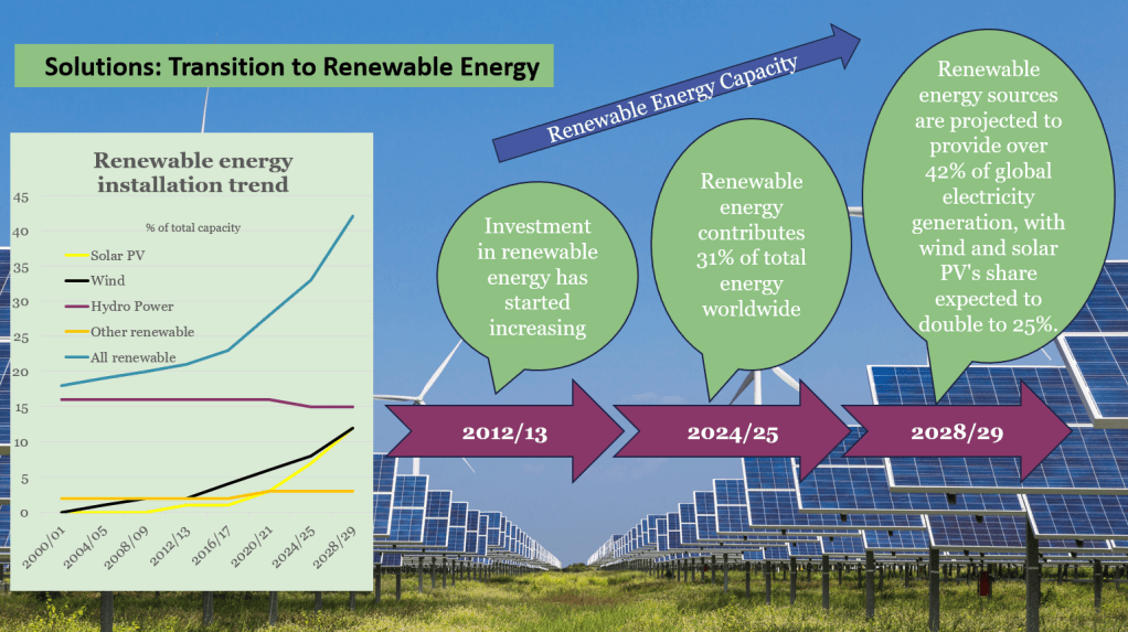 To fight Global warming, we need to reduce our greenhouse gas emissions. We need to promote renewable energy installation. The diagram tells us that the share of renewable energy is continuously increasing over time.