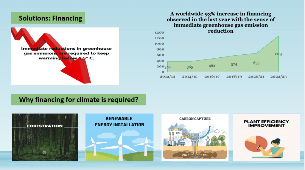 Climate financing is one of the options to fight with Global warming. It provides financing for forestation, renewable energy installation, carbon capture, and plant efficiency improvement.