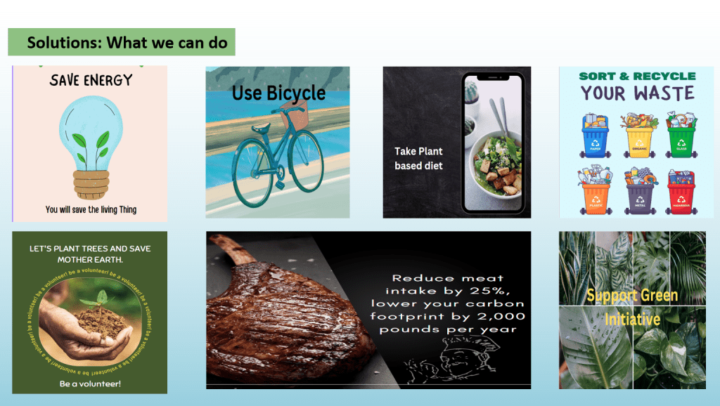 We are all responsible for Global warming at our individual level. This picture is depicting what we need to do in our daily life to reduce carbon footage.