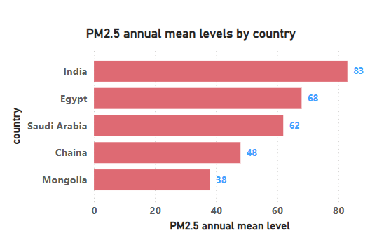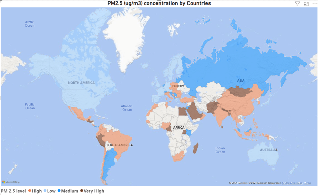 In the figure, we can observe the PM2.5 levels across the world. Countries like India, China, Mongolia, Saudi Arabia, Egypt, and Peru are among those suffering from significantly high PM2.5 levels. These elevated levels are primarily driven by factors such as industrial emissions, vehicular pollution, construction activities, burning of fossil fuels, and natural phenomena like dust storms.
