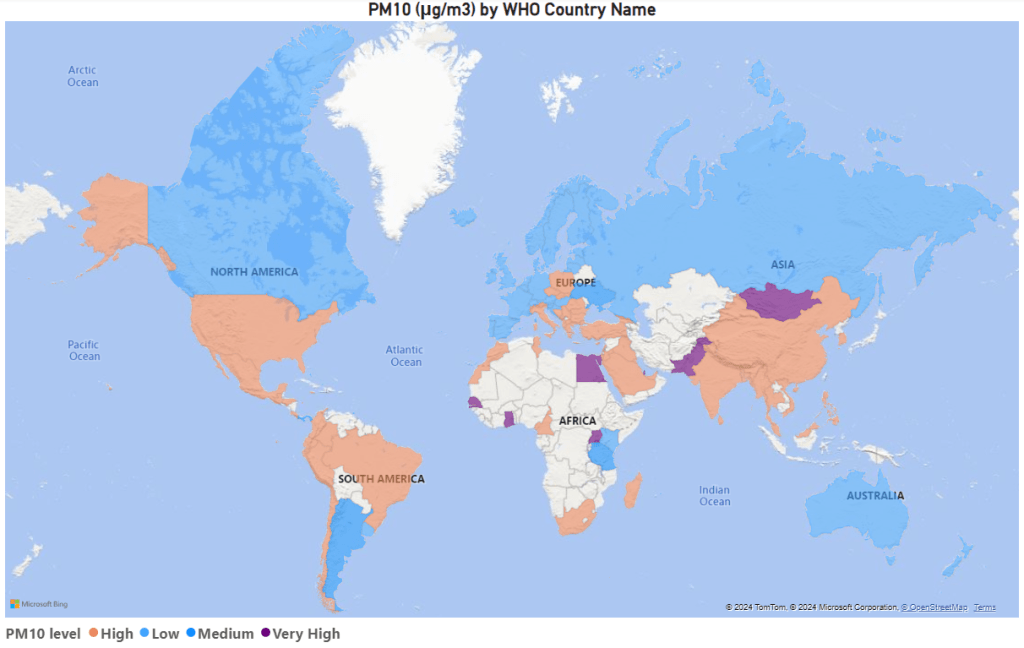 In addition to PM2.5, we can assess the PM10 levels globally. India, China, Mongolia, Saudi Arabia, Egypt, and Peru are among the countries experiencing notably high PM10 levels.