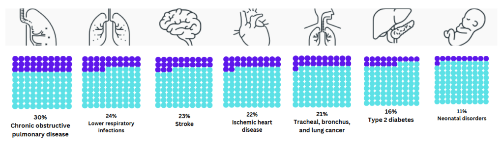 In India, PM2.5 is a major cause of death from chronic obstructive pulmonary disease, lower respiratory infections, stroke, ischemic heart disease, tracheal, bronchus, and lung cancer. It is also a contributing factor to type 2 diabetes and neonatal disorders.