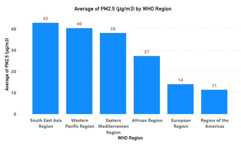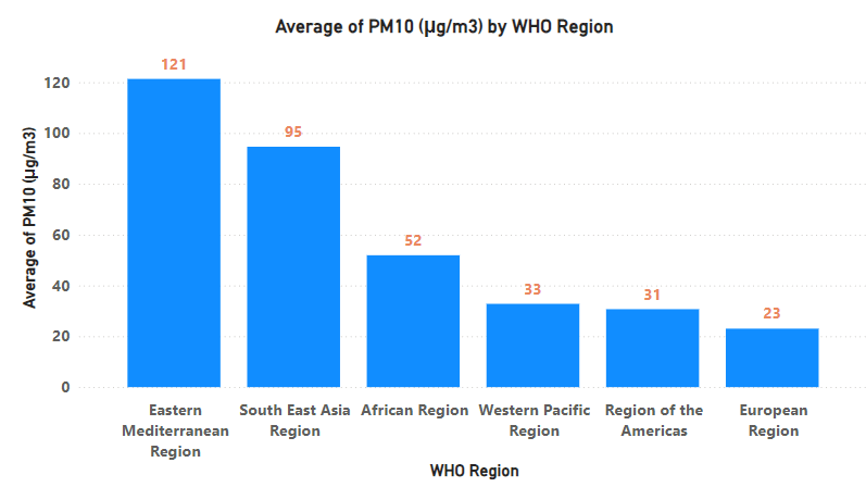 WHO has divided the whole world into many regions. The below diagram shows the average PM2.5 and PM10 concentrations over the regions.