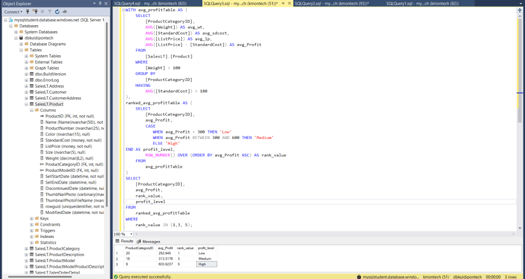 In my recent projects, I utilized Azure SQL Server, MySQL, and Data Lake for data storage. To facilitate easy and secure calculations, I connected Azure SQL Server with SQL Server Management Studio (SSMS). In the photo below, I have provided a sample SQL calculation performed in SSMS while connected to Azure SQL Server.