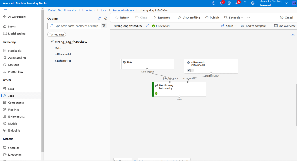 In a sample project, I completed a batch deployment, which was the most commonly used method in my previous project. After the deployment, I ran a job to score the new data, and I obtained the final predictions in a CSV file saved in the datastore.
